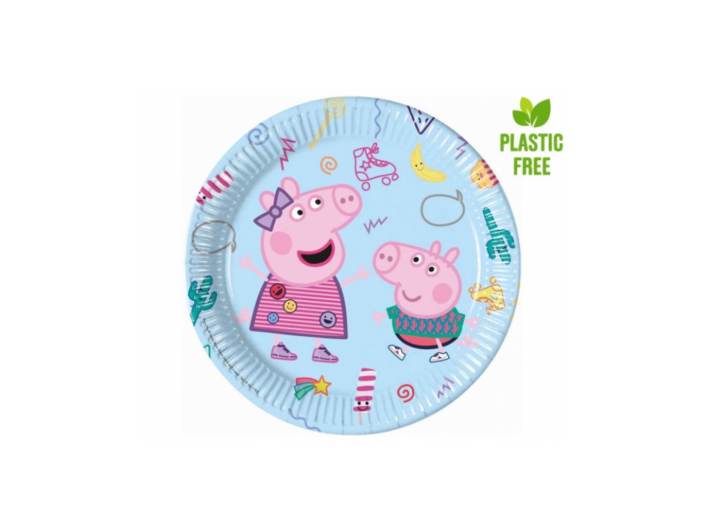 Ekologické papírové talíře s oblíbeným motivem Prasátko Peppa o průměru 23 cm. Ideální doplněk pro dětskou narozeninovou oslavu, bez obsahu plastů a šetrné k přírodě.