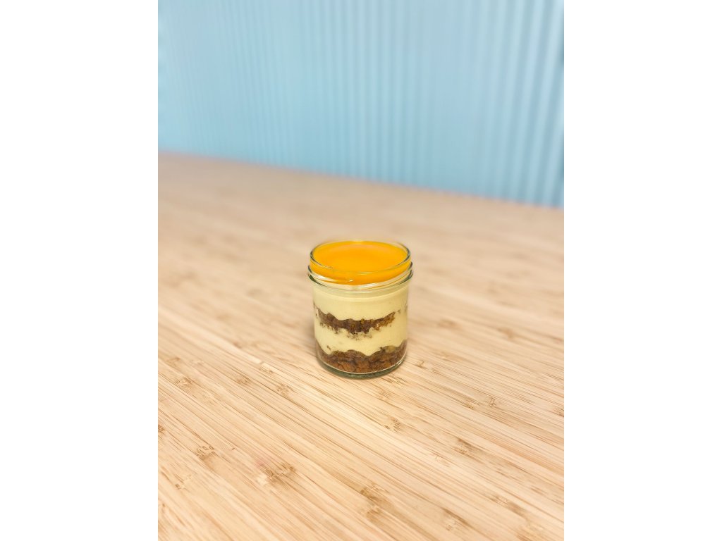 Ingredients: mascarpone, mango, caramel biscuits, cream, butter, sugar, gelatine.
