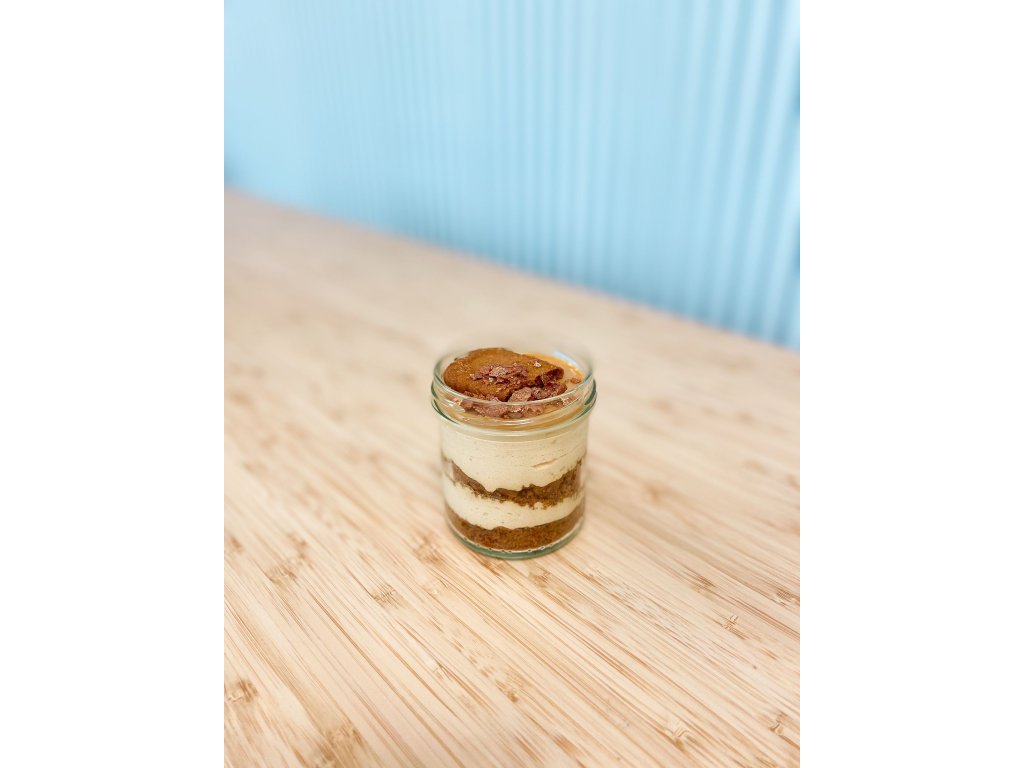 Krém z mascarpone a slaného karamelu na korpusu z karamelových sušenek.