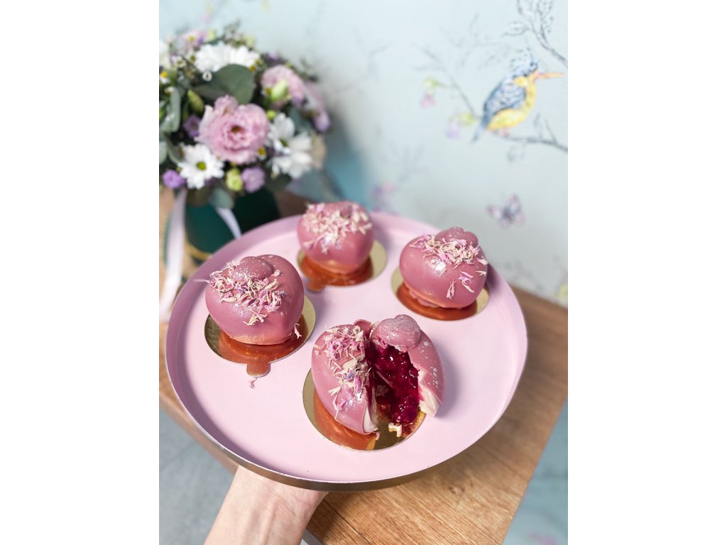 V srdci najdete lehký mousse z ruby čokolády a vklad z malin, celé obalené v ruby čokoládě.