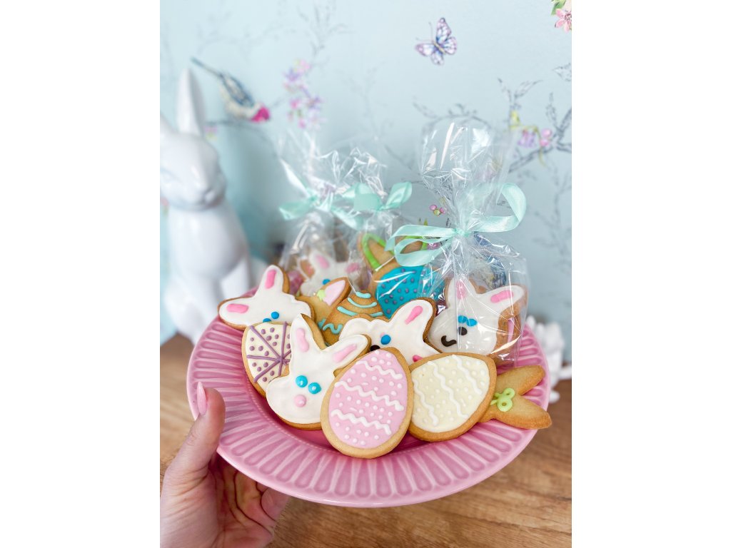 Sušenky jsou krásně křehké díky poctivému máslu a zdobené barevnou polevou do tvaru roztomilých zajíčků a kraslic. Jsou ideální jako drobná pozornost pro koledníky, stylová dekorace k jarní kávě nebo prostě jen tak pro radost k zakousnutí.